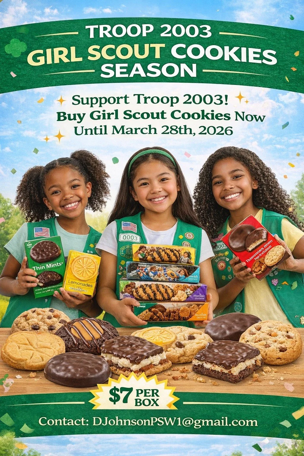 Buy Cookies from Our Girl Scout Troop 2003! Laci Chisholm February 16, 2026 buy cookies Troop 2003 is now selling Girl Scout cookies! 🍪 Your support helps fund badges, camping adventures, and leadership experiences for our girls. Thank you for helping us grow, learn, and explore.