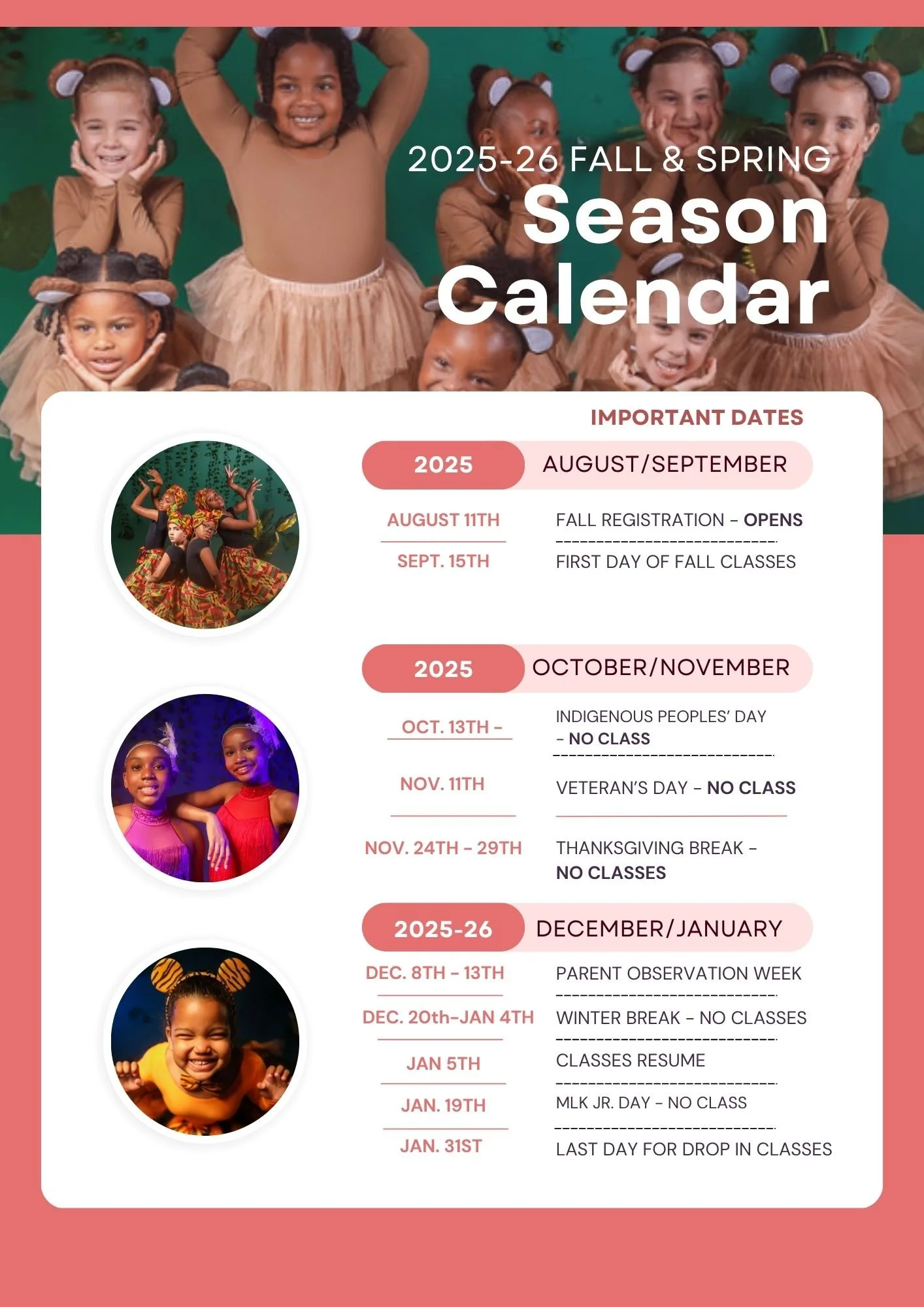 To find the best class for your child, please review the dance schedule below. Each class listing details the dance level, the appropriate age group, the dance teacher, and class time. For guidance on class levels, please read Class Levels and Descriptions. If you believe your child would benefit from a higher class level, please consult with our Children’s Program Director, Ms. Beebs for further information.